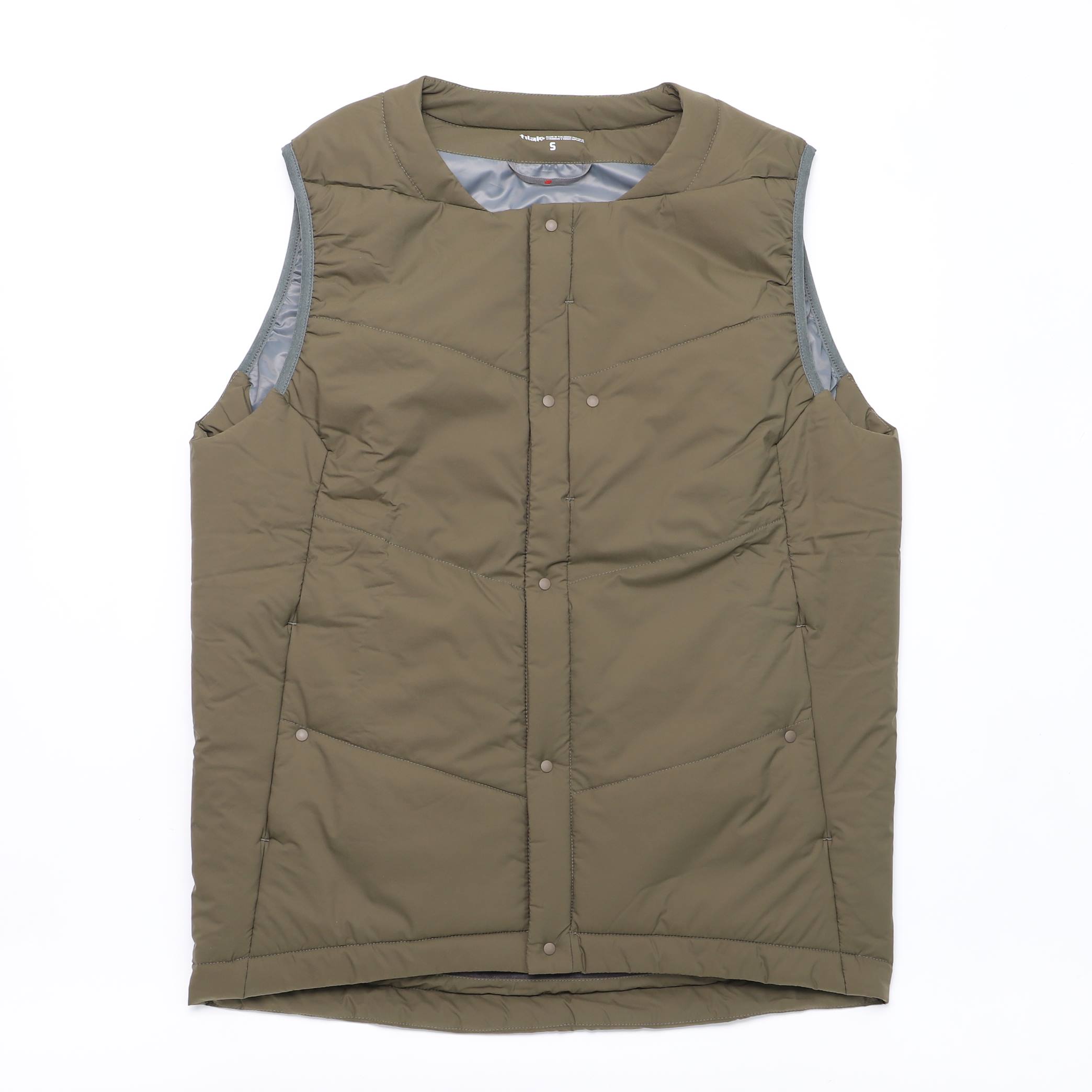 デザインはシンプルなクルーネックのデザイン。シャツはもちろん、フードやハイネックのアイテムとも合わせやすく、レイヤードスタイルに最適なベスト。